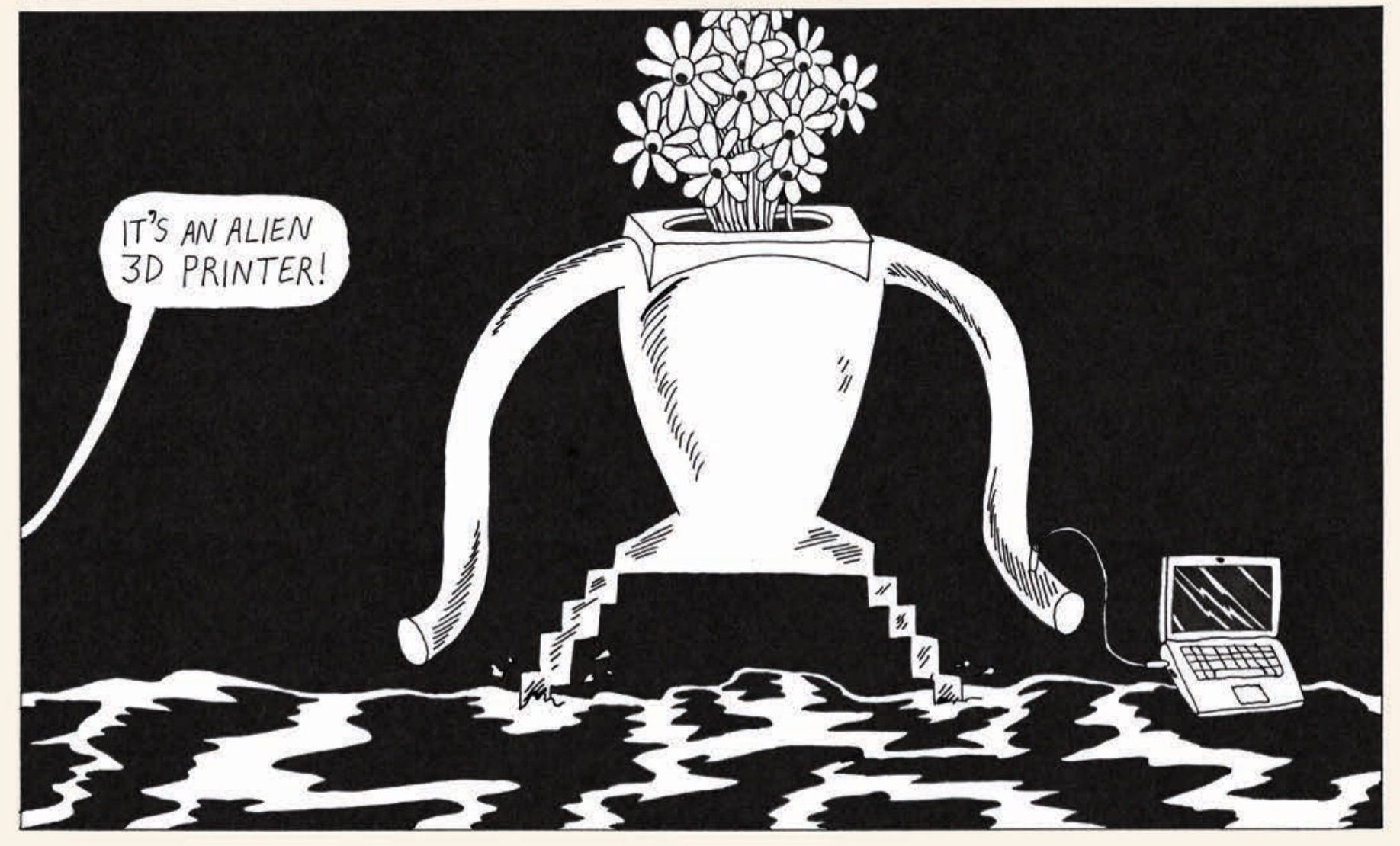 Gradin’s deeply weird and propulsive narrative comes through particularly in an alien-3D-printer sequence. Atilla the Hunny leads Ponce through black-and-white panels, splashing through dark water, a blank void around them. She promises something special, and there it is! An alien-3D-printer that grinds out a deer with the organs still forming, a gelatinous taxi generating a “holy fuck” from Ponce.