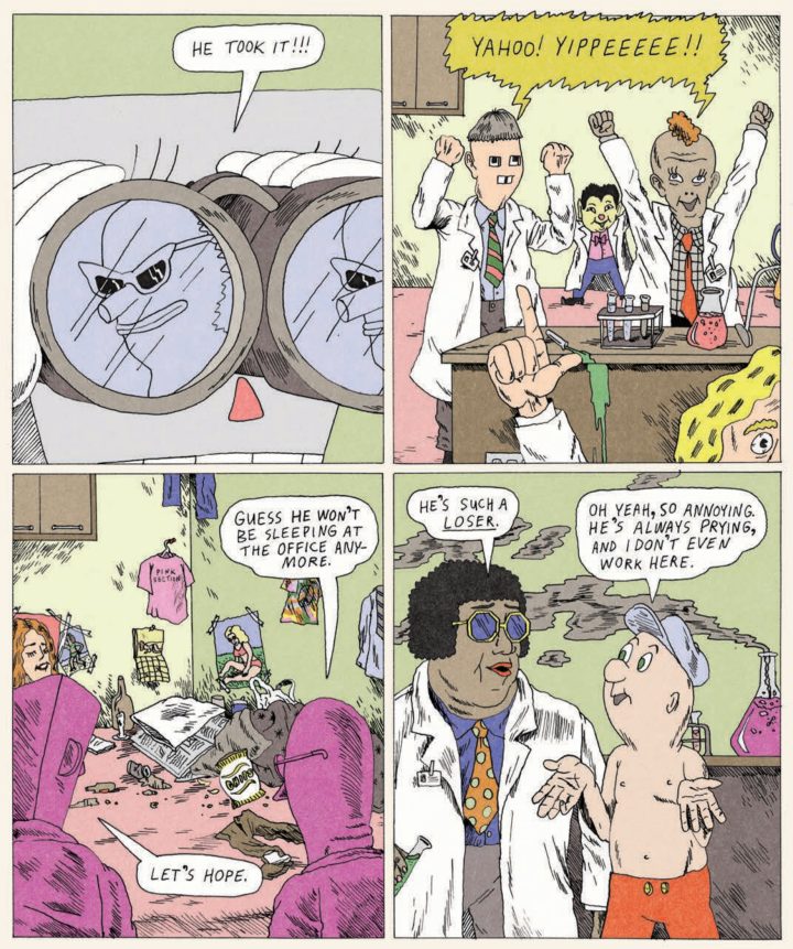 In the marketing for Pageant, Gradin is compared to names like Marc Bell, Gary Panter, and Mark Beyer. Gradin is clearly influenced by these underground titans, but I think the comparisons set up false expectations of the “weird” the reader will experience. Gradin is working in an underground visual style, but he’s using that mode to tell a more conventional, linear story with commercial appeal. The visual dream-logic of Marc Bell’s work in Hot Potatoe or Gary Panter’s collage nightmare fuel in Jimbo’s Inferno are levitating works, but they operate on a different plane than Pageant.