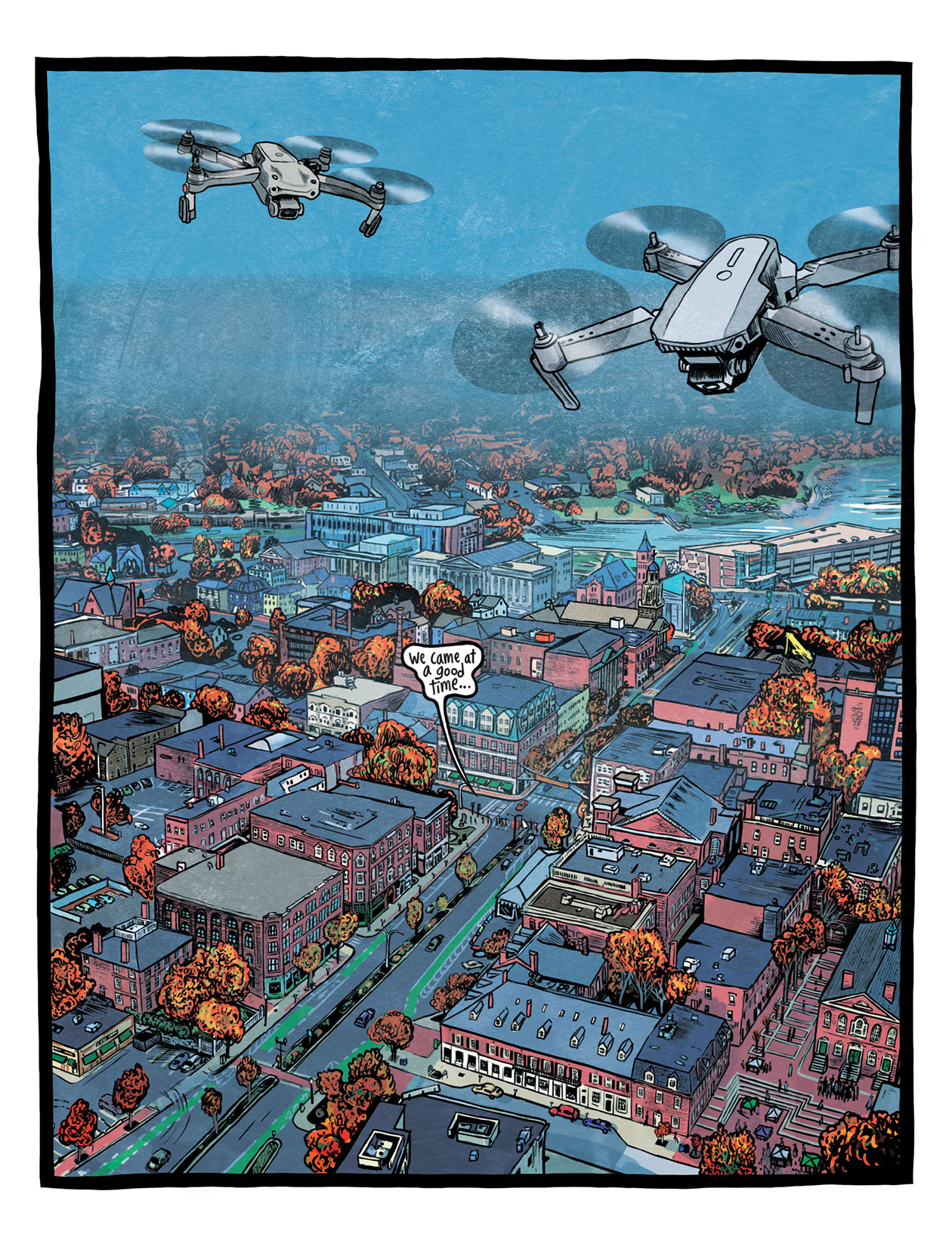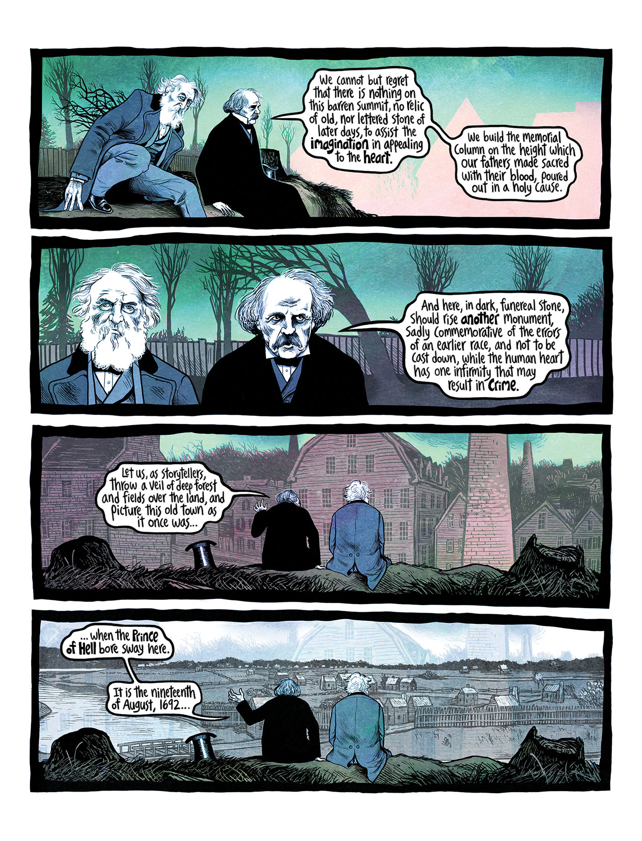Wickey's illustrations are magnificent throughout, always exaggerated, teetering ever on the brink of loose, careening madness, but always holding together. His cartoonish, forbidding faces make Salem's lunacy seem even darker while maintaining the sense of how ridiculous all of it was; every time the situation escalates, this blend of black humor and deadly earnestness drives home what a razor-sharp atmosphere must have permeated the town. In the 1860s, Longfellow and Hawthorne's sojourns have the quality of scrimshaw, shaded and dated, more suited to an illuminated text than a comic. And in the modern period, the vibrancy and color serves as a suitable distraction to the lessons we fail to learn. If it is not the best-drawn major comic of 2025, More Weight is at least the one whose art most successfully matches what its story is trying to accomplish.