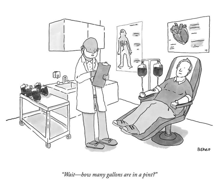 The first one, it's a person who's have having blood drawn, There's a doctor standing next to him looking at a clipboard. And next to the doctor, there's a tray of bags and bags of blood. And the doctor's saying, “wait, how many pints are in a gallon?” or something like that.