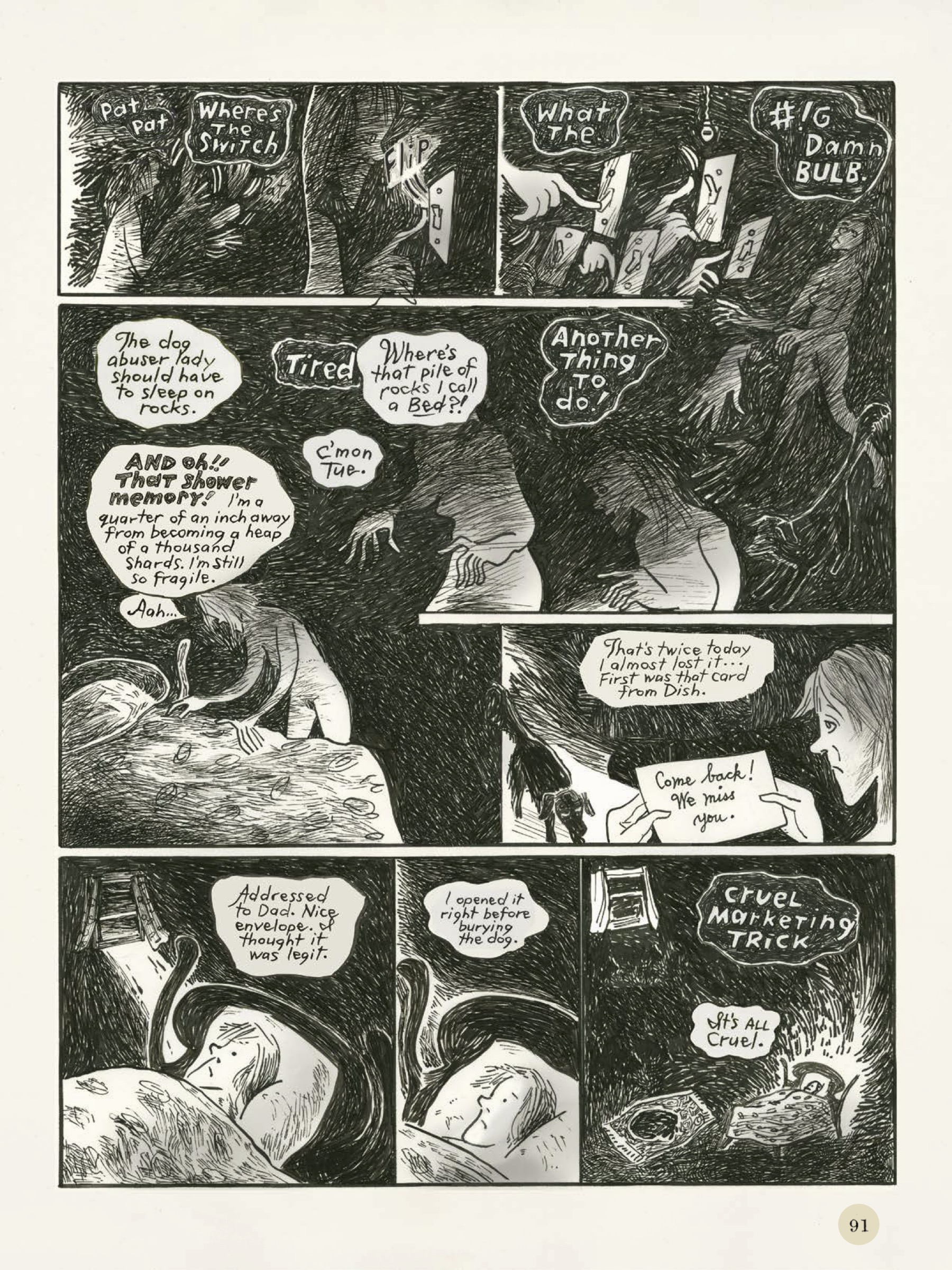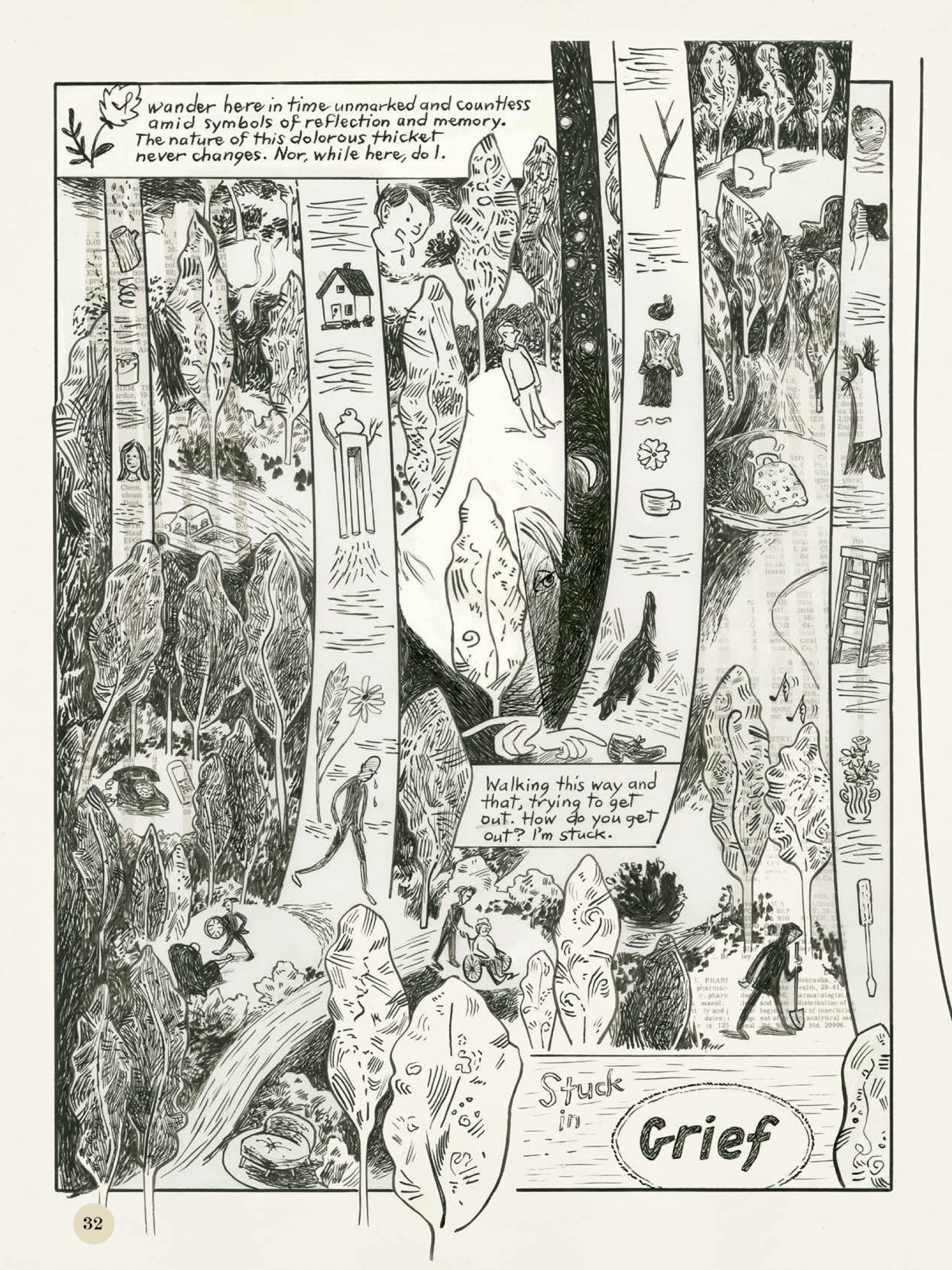 Although certain pages adhere to a traditional grid structure, others are completely untethered, with images flowing into or weaving around each other, often swamped by text, overflowing with symbols, or swathed in darkly etched shadows that encroach from every angle at once. Some sequences have the loose spontaneity of a sketchbook, while others are rendered in exquisite detail. A two-page spread depicting Tyler’s family home, with its flattened perspective and flowing curlicues, recalls the elegantly designed book jackets of Edward Bawden. But elsewhere, an entire page filled with broken lines plummeting into a pitch-black void, each representing a life cut short, feels like the visual equivalent of pressing on an exposed nerve.