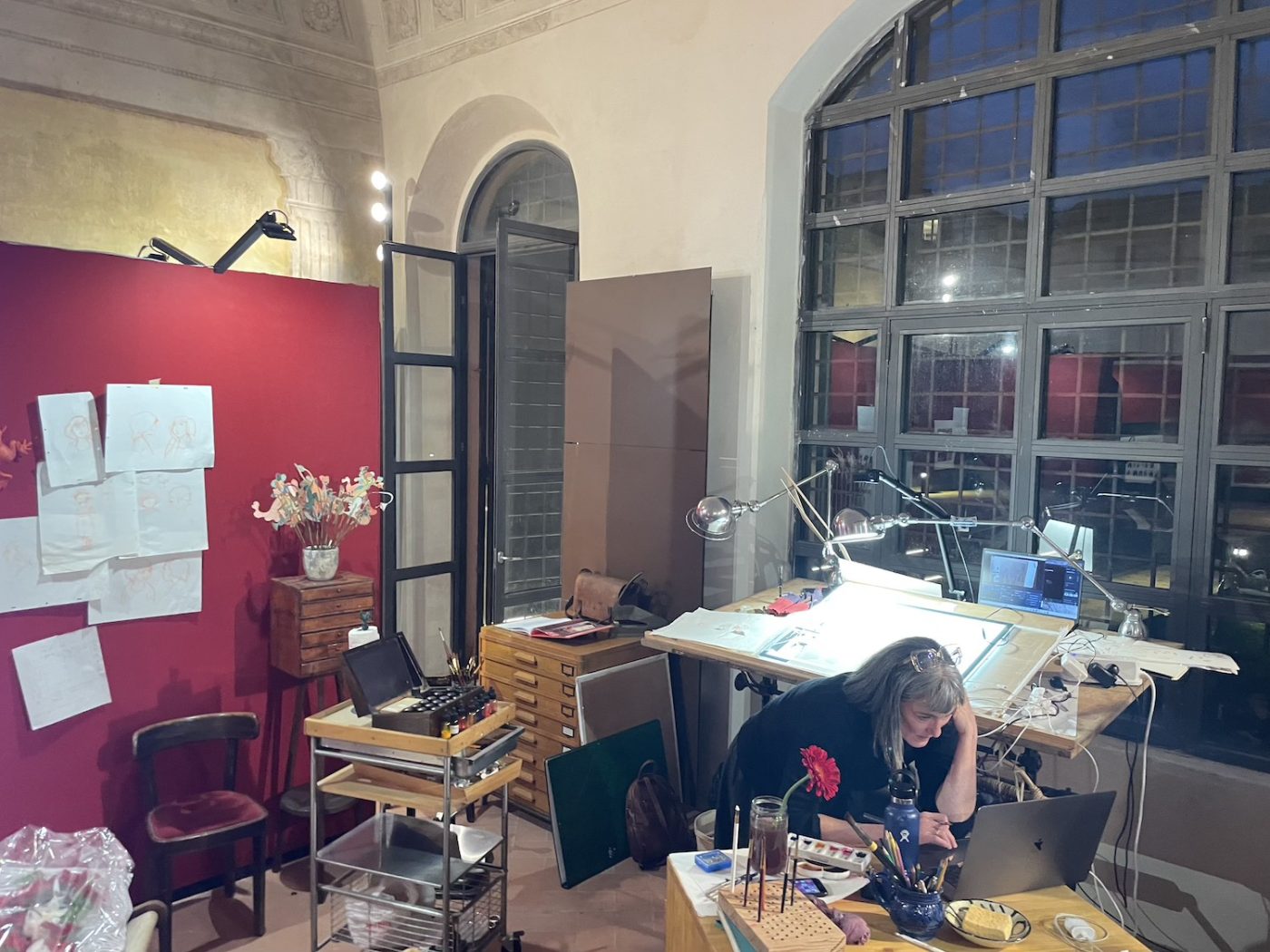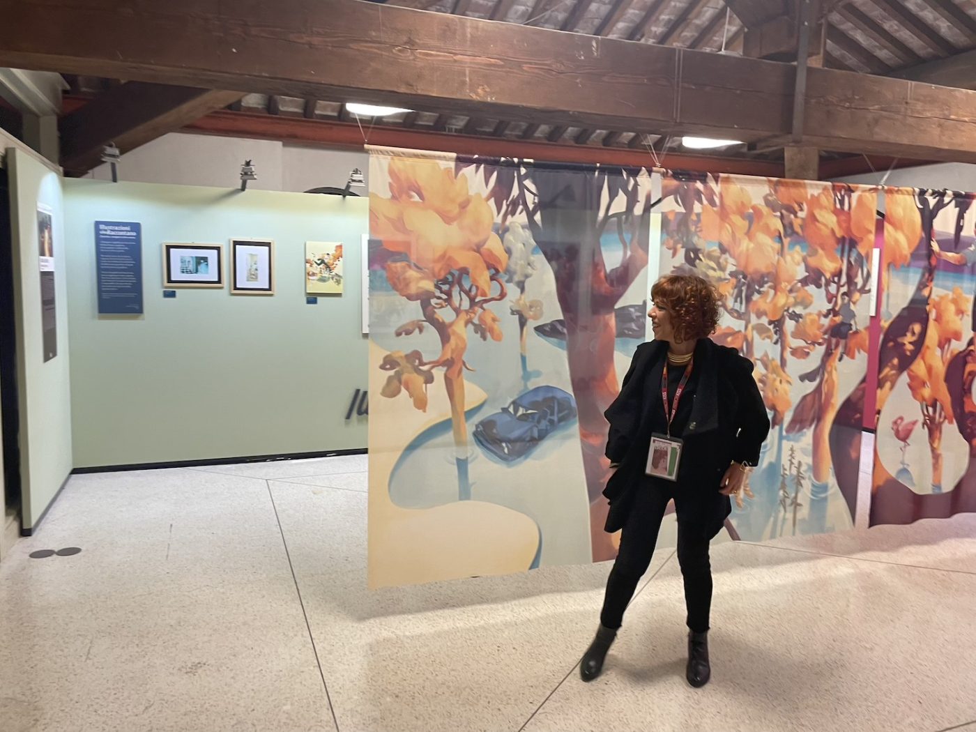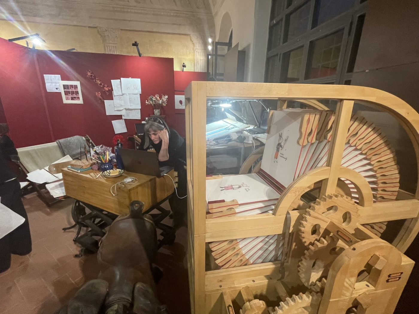 The most peculiar and interesting exhibition was dedicated to French artist Rebecca Dautremer (curated by Cosimo Lorenzo Pancini), who also created this year’s edition poster. Not only was her artwork on display, but her studio itself was moved and reconstructed in its entirety inside one of the palace rooms. During the days of the festival, she was there working on her first-ever graphic novel (after years of illustrated books). A truly one-of-a-kind experience for the audience, and surely for the artist as well, who generously put herself and her art literally in the middle of the room. She works in large formats and is able to envision rich and colorful scenarios, like in a theater, a word she uses often to describe her work. The room was full of finished art, work in progress, memorabilia, and intriguing machineries.