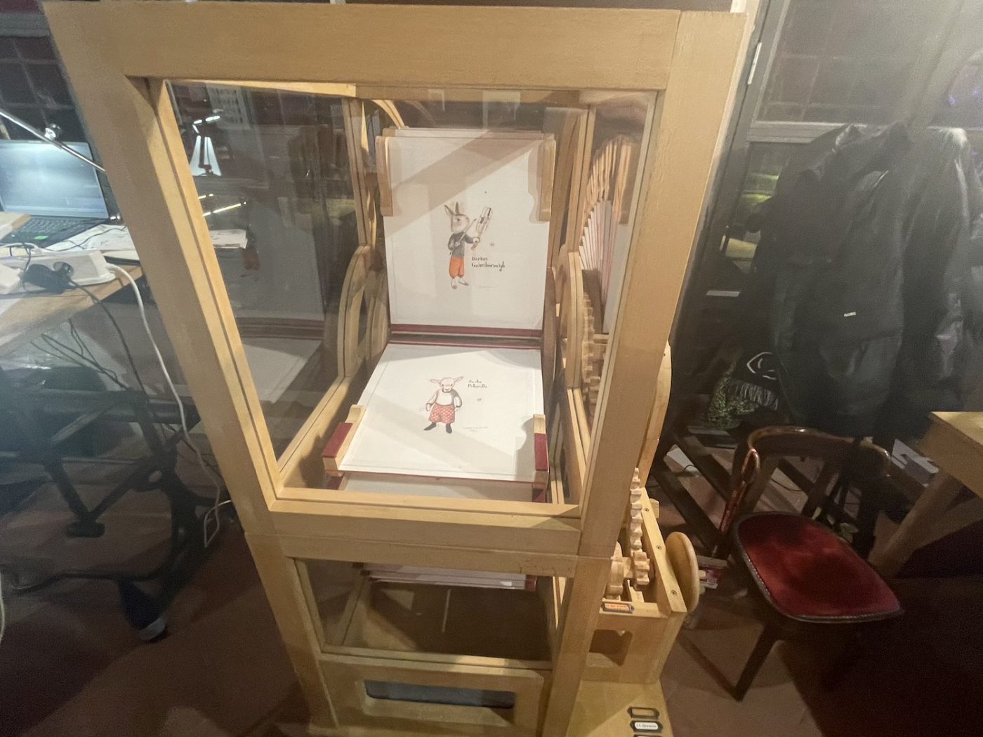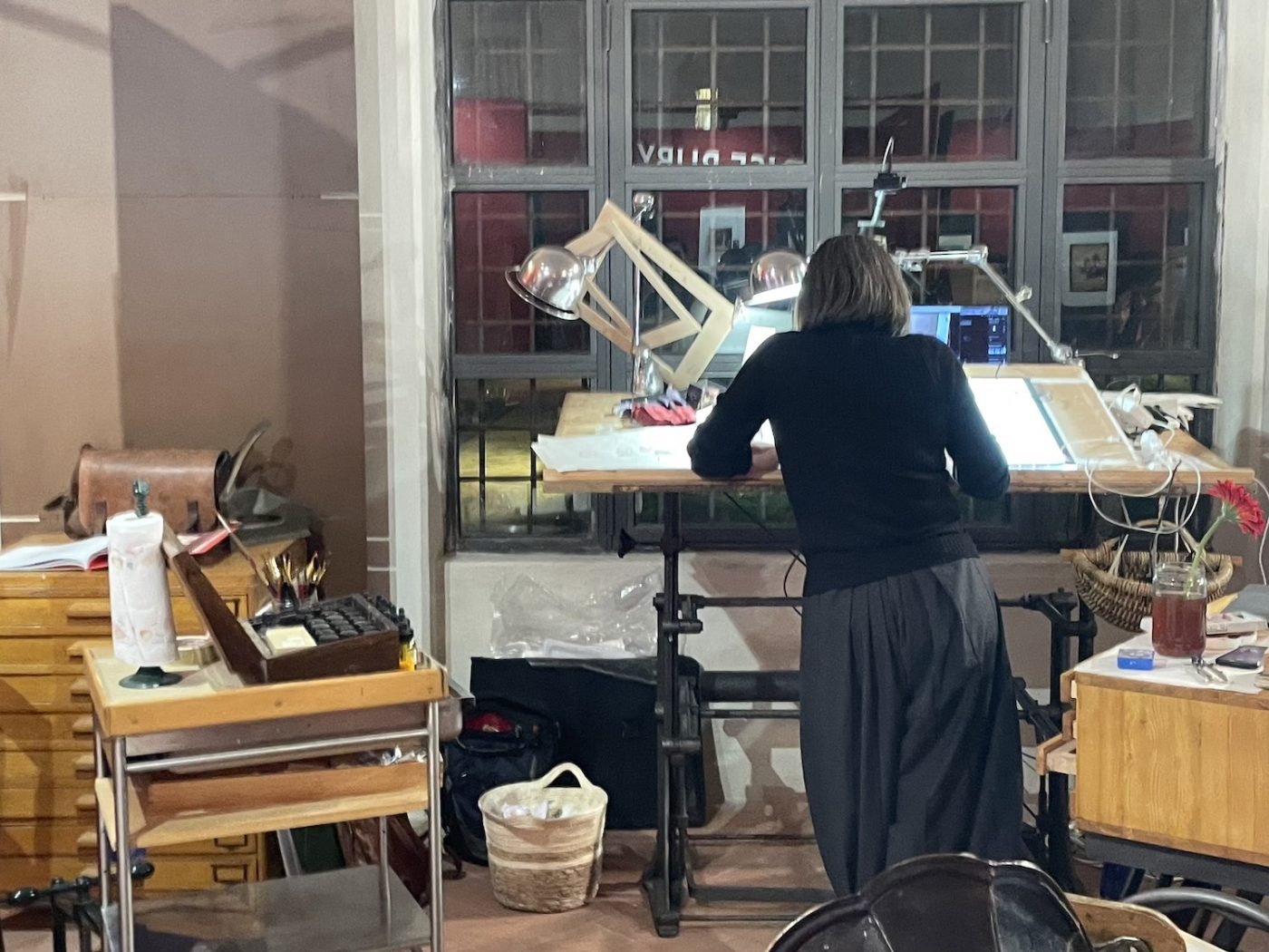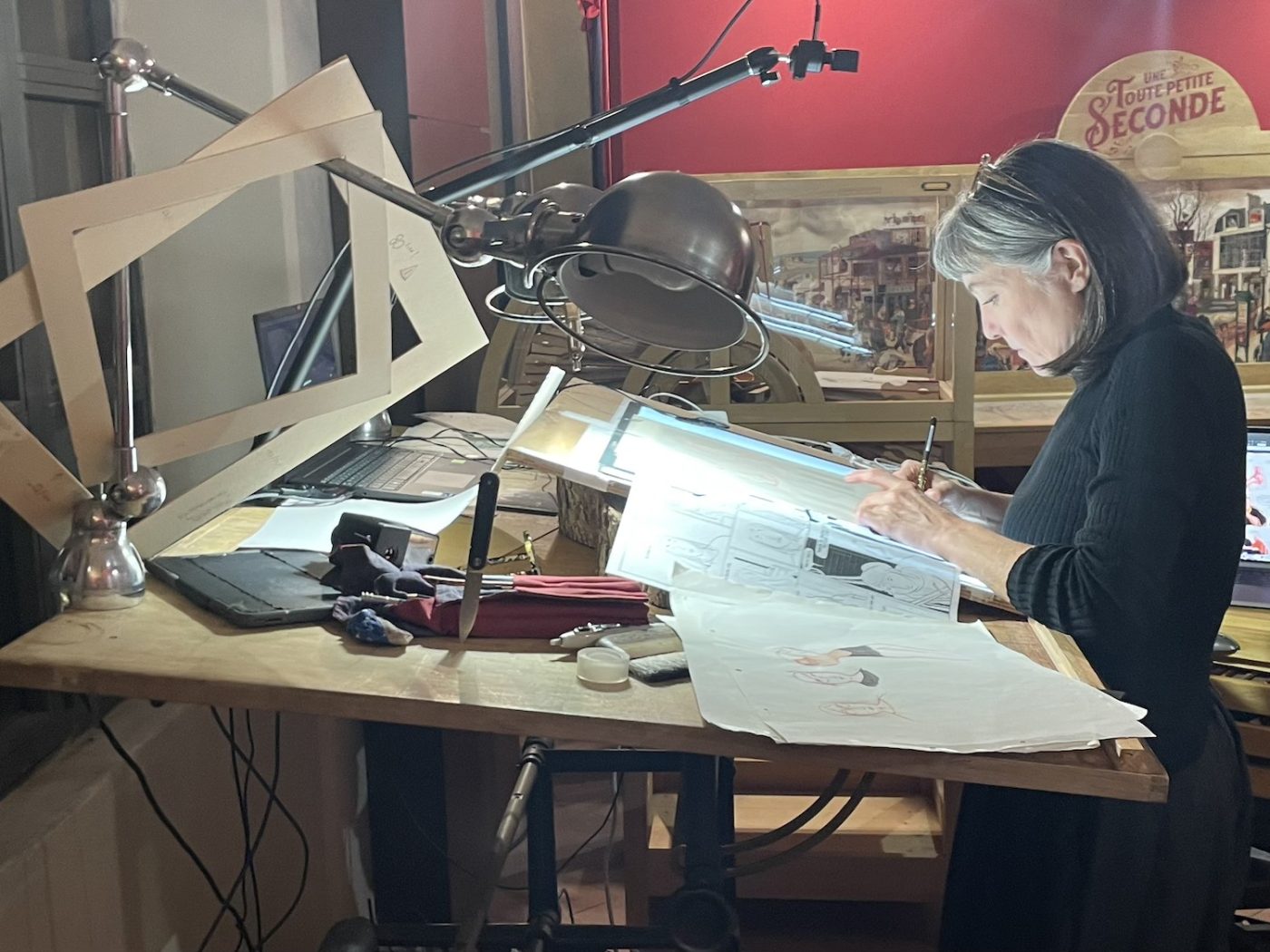 The most peculiar and interesting exhibition was dedicated to French artist Rebecca Dautremer (curated by Cosimo Lorenzo Pancini), who also created this year’s edition poster. Not only was her artwork on display, but her studio itself was moved and reconstructed in its entirety inside one of the palace rooms. During the days of the festival, she was there working on her first-ever graphic novel (after years of illustrated books). A truly one-of-a-kind experience for the audience, and surely for the artist as well, who generously put herself and her art literally in the middle of the room. She works in large formats and is able to envision rich and colorful scenarios, like in a theater, a word she uses often to describe her work. The room was full of finished art, work in progress, memorabilia, and intriguing machineries.