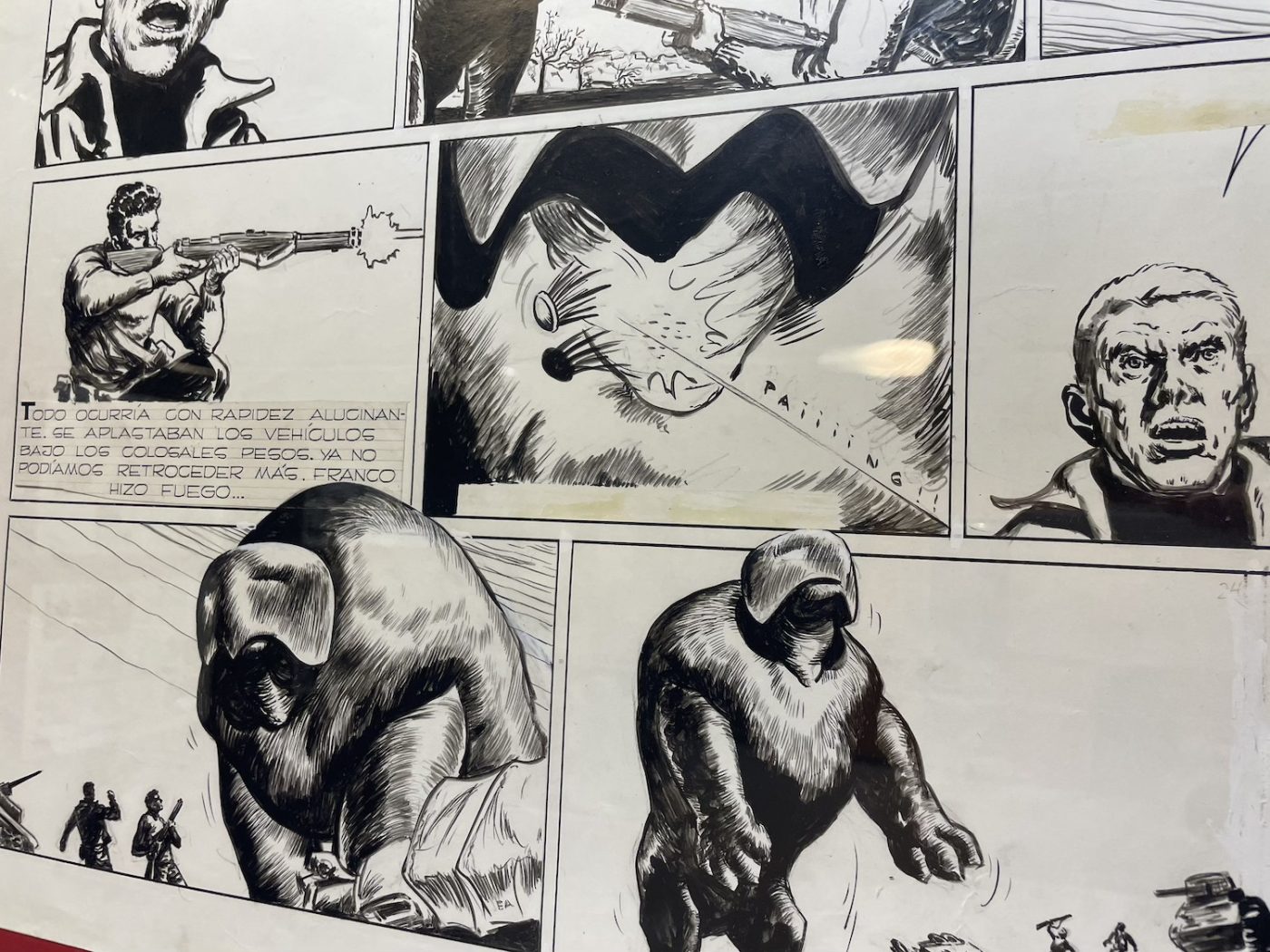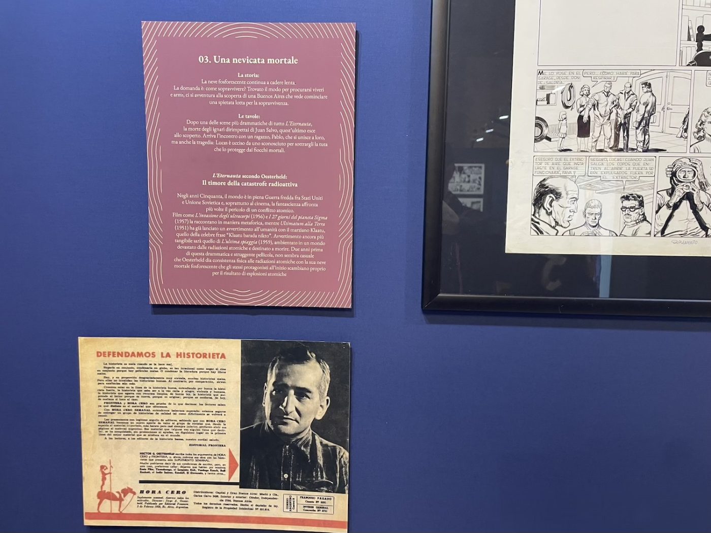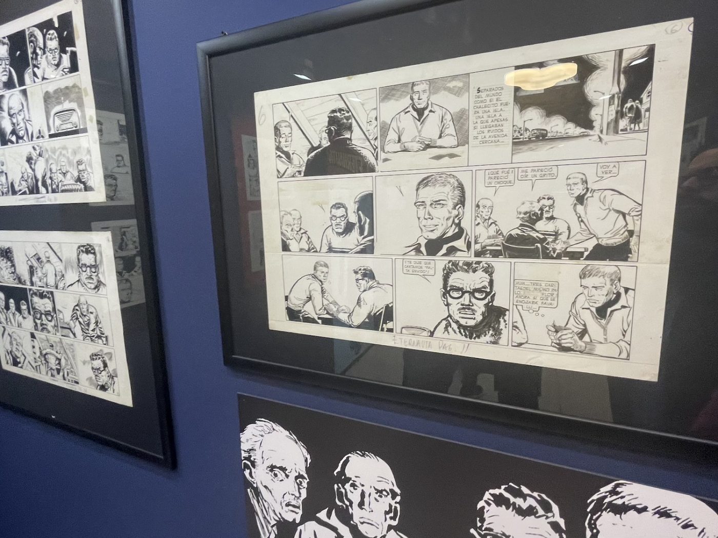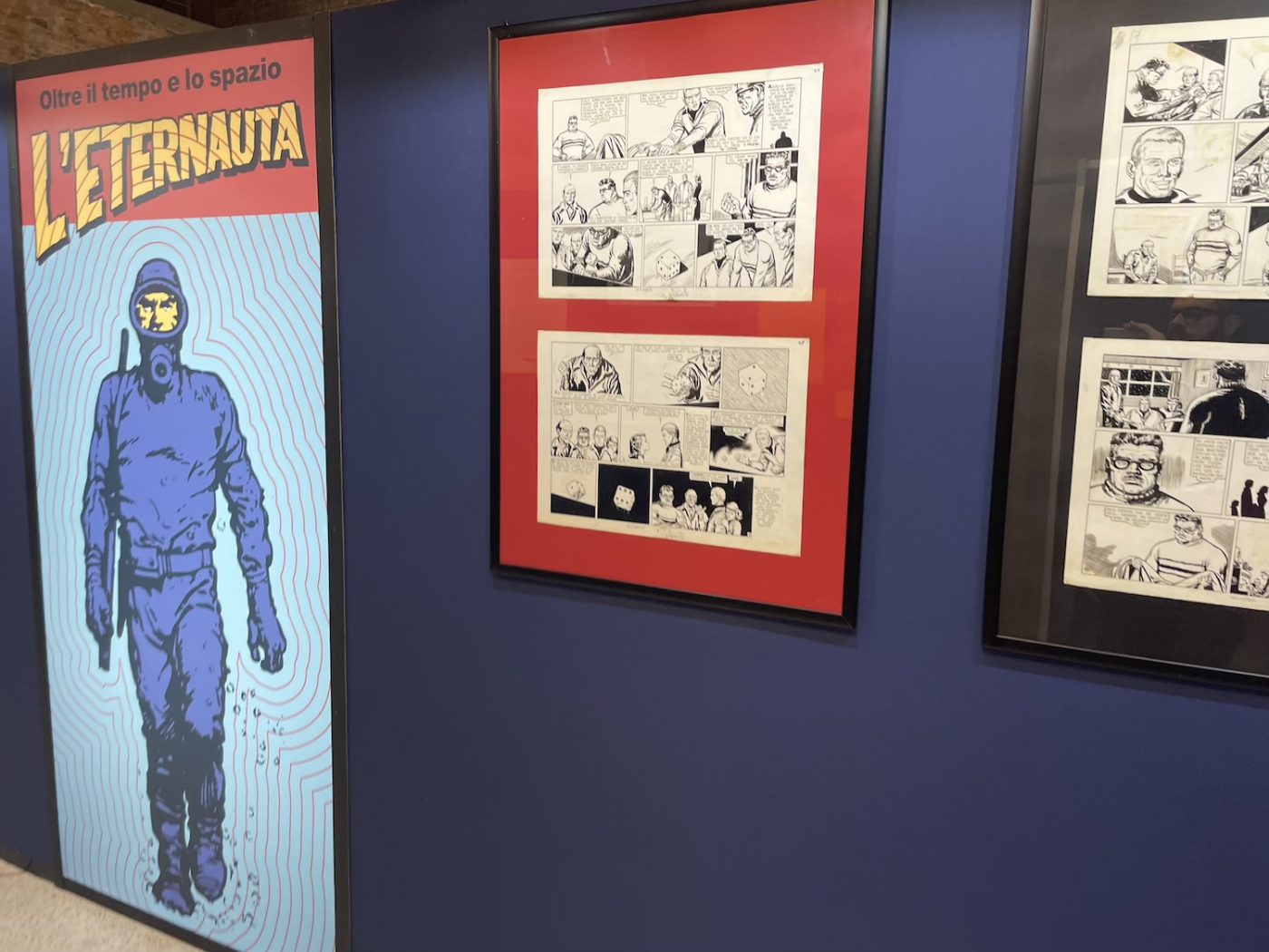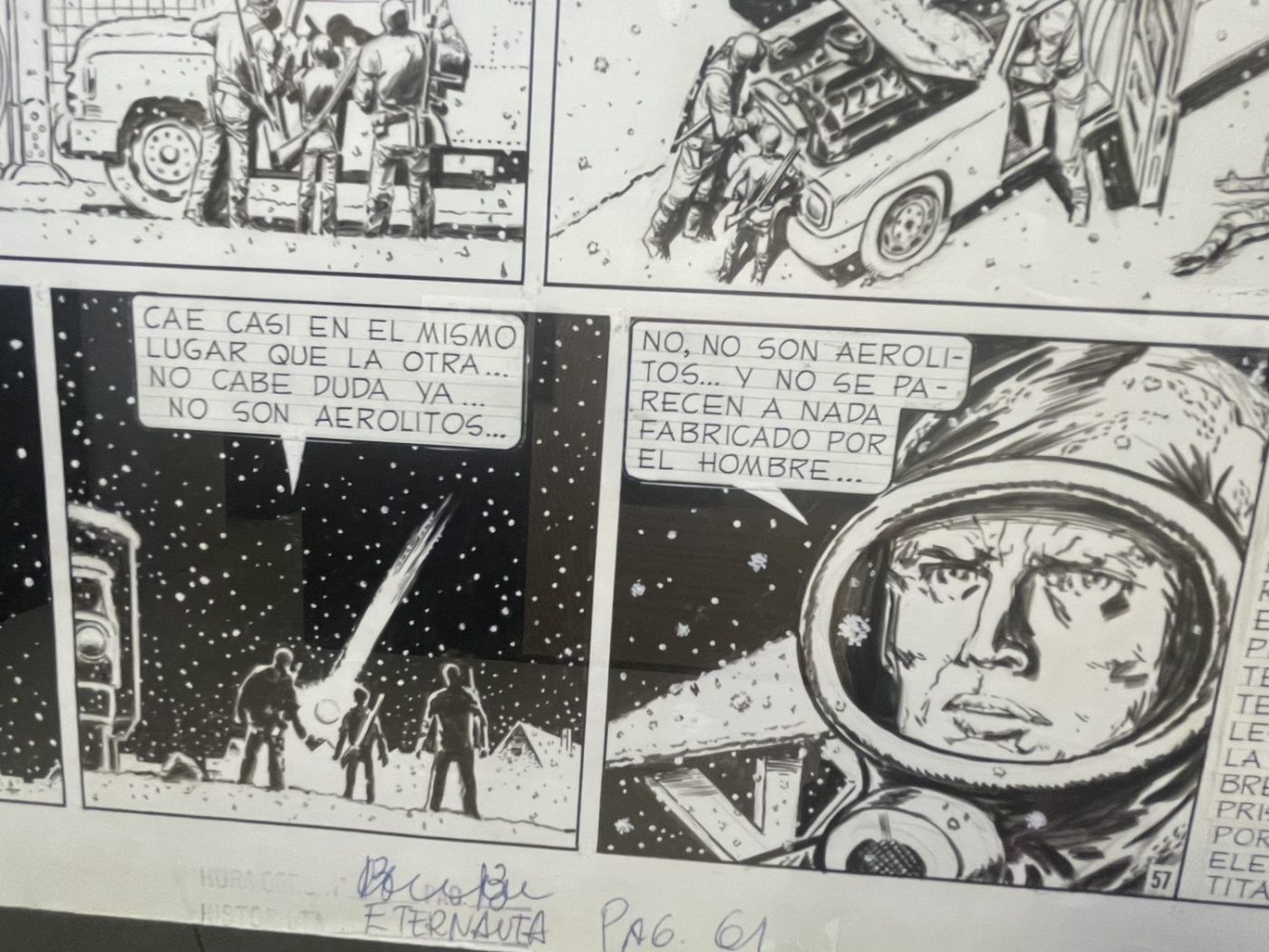 The Eternauta exhibition was huge, possibly the largest exhibition ever dedicated to the graphic novel by Héctor Oesterheld and Francisco Solano López, featuring more than a hundred original pages. Perhaps even too big, I’d say. And as the curator explained to Fumettologica, he had “divided the story into several sections, like stations, focusing on key moments: the snowfall, the protagonists acting like survivors, the resistance, and finally the revelation of who the invaders are. For each of these sections, we selected meaningful pages, sometimes with commentary, sometimes simply for the strength of the images.”
