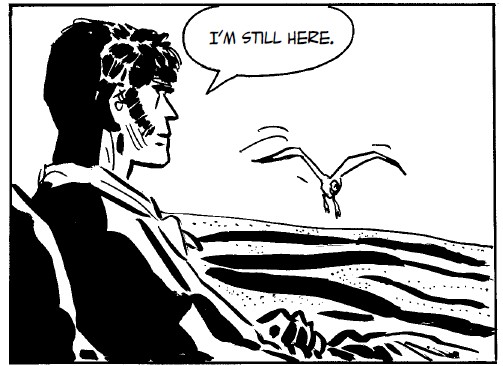 When Corto Maltese looks at the titular seagull in “The Seagull’s Fault,” it’s the simplest of drawings: the bird is of a basic shape, the sandy beach is just black solid lines and dots, even our main figure is sheared of details — what we see of his mouth is a single half line. Yet in that panel, just like "the man of destiny" panel, there holds an entire world. The full measure of a man, something Pratt achieved with every drawing. Thirty years after the death of its author and almost half a century after its original publication, Fable of Venice still holds up. It is as Corto says, “I’m still here.”