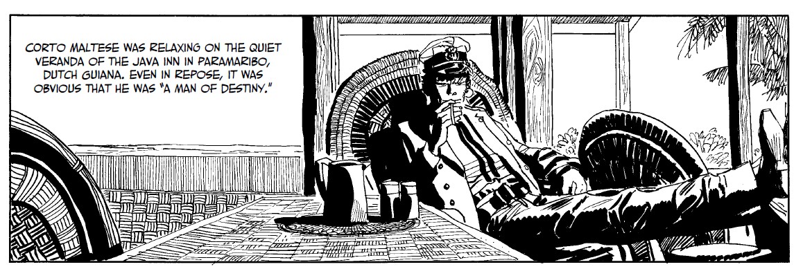 The opening of “The Secret of Tristan Bantam” shouldn’t work. You shouldn’t be able to open an adventure story, a story of brave sailors, assassination attempts, magic, treason and historical mystery, with something as static as a shot of man lounging in a chair; and if you do decide to simply show a would-be man of action in a pose of absolute inaction you certainly can’t have your narration refer to him in such grandiose terms as a “man of destiny.” That is – you can’t, I certainly can’t. But Hugo Pratt can. When he draws Corto Maltese, even at repose, he always draws a man of destiny. A man at ultimate ease with himself, who knows who and what he is, yet a possessor of nearly-endless curiosity. That opening panel shows man looking lazily at the world, at the reader, knowing that the rest would soon be over; some strange things would come.