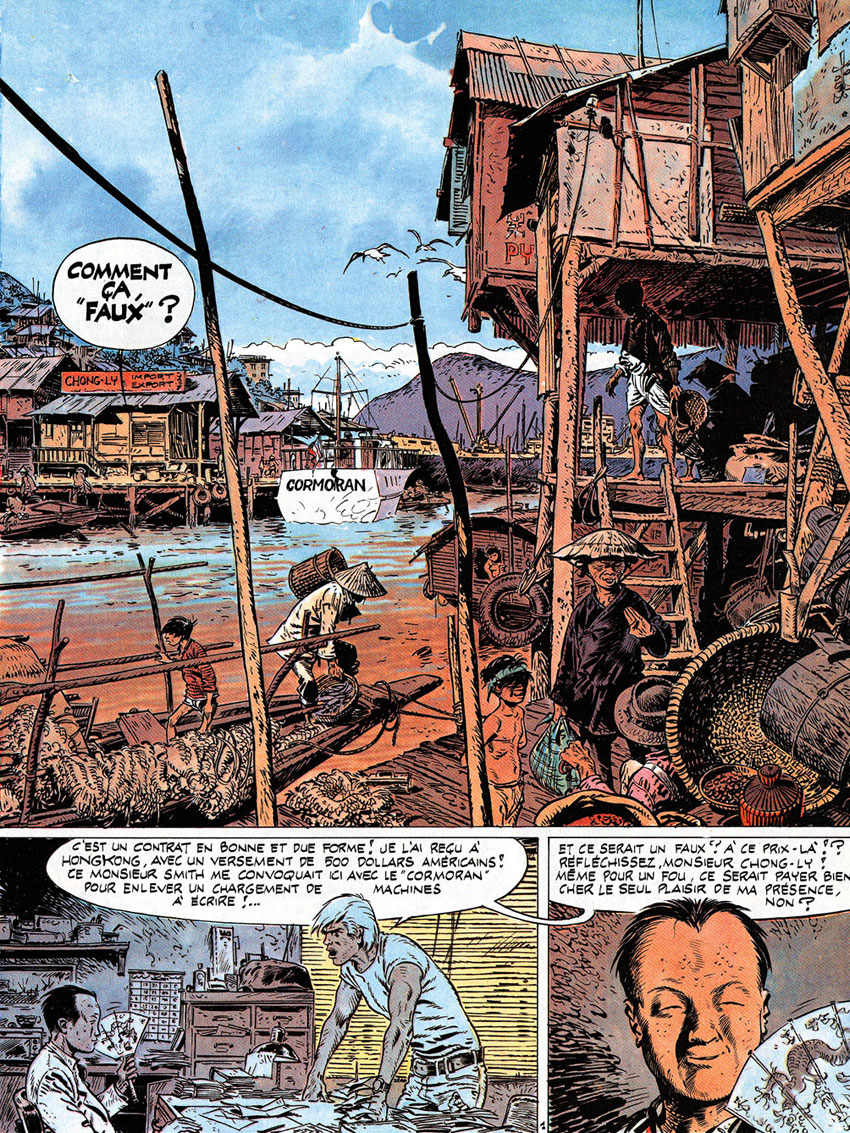 In 1966, Greg penned a series especially for his protégé. This was Bernard Prince, the tale of an Interpol agent turned explorer, who roamed the globe on a sloop called the Cormoran. Prince had two companions: the young Pakistani Djinn and Barney Jordan, a whiskey-swilling sailor. This, of course, echoed Tintin and Captain Haddock. Yet, from the start, it had hints of the Hermann to come. For what really made the series a hit was its villain, the grotesquely outsize "General Satan."