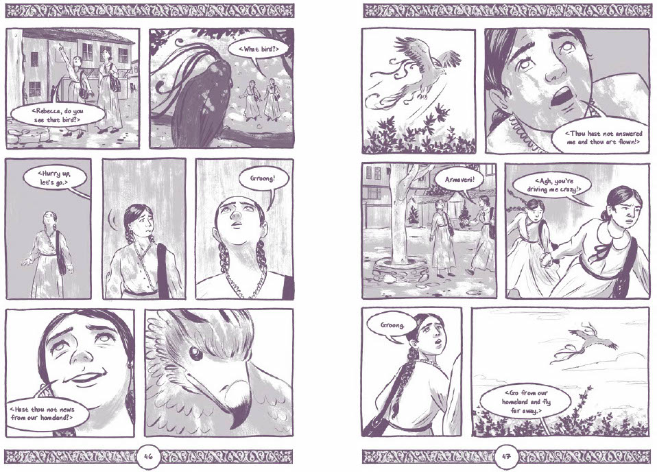 RA: That segues into a question I had for you. You also chose to represent Armenian language in a couple different ways; who is speaking what language and how changes a couple times. There are times where you have the brackets to indicate that this person is speaking in Armenian. Sometimes you present the dialogue with the written alphabet. What were some of the meanings and decisions behind that?