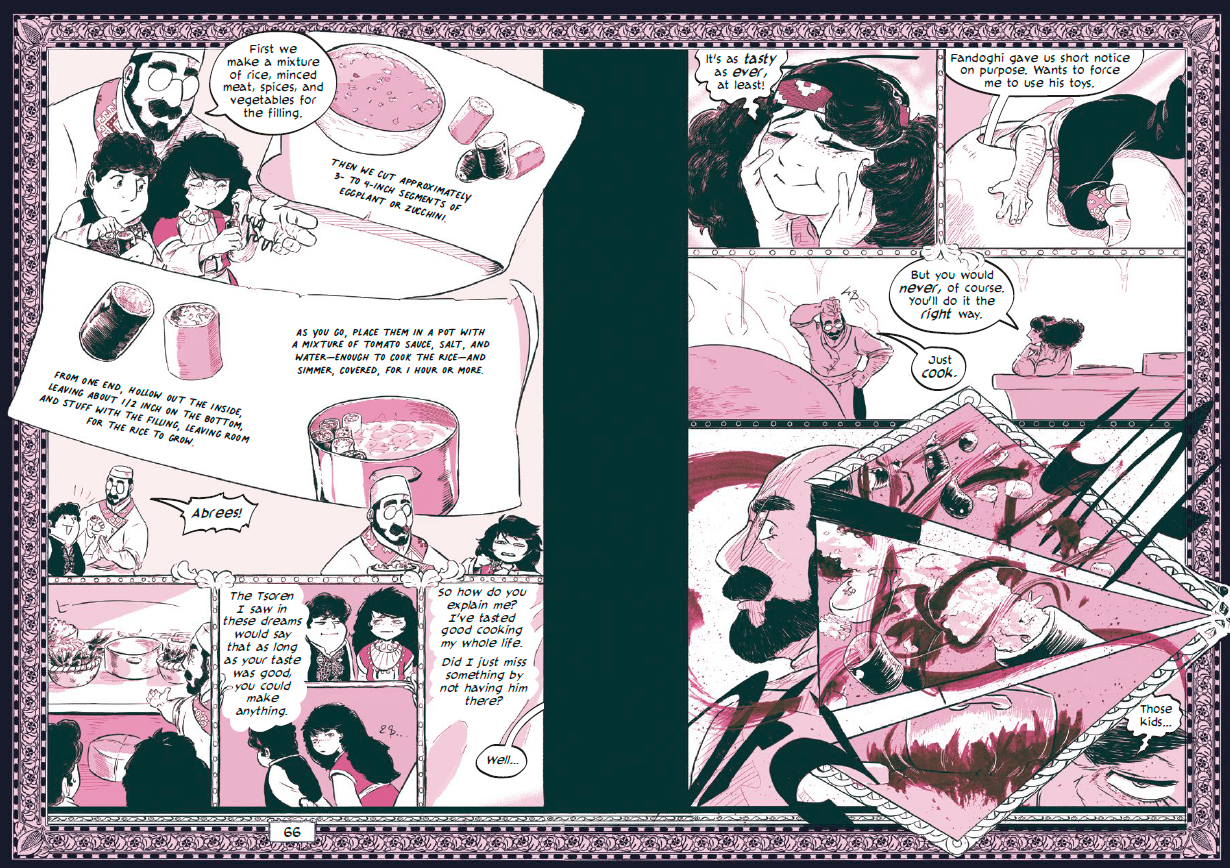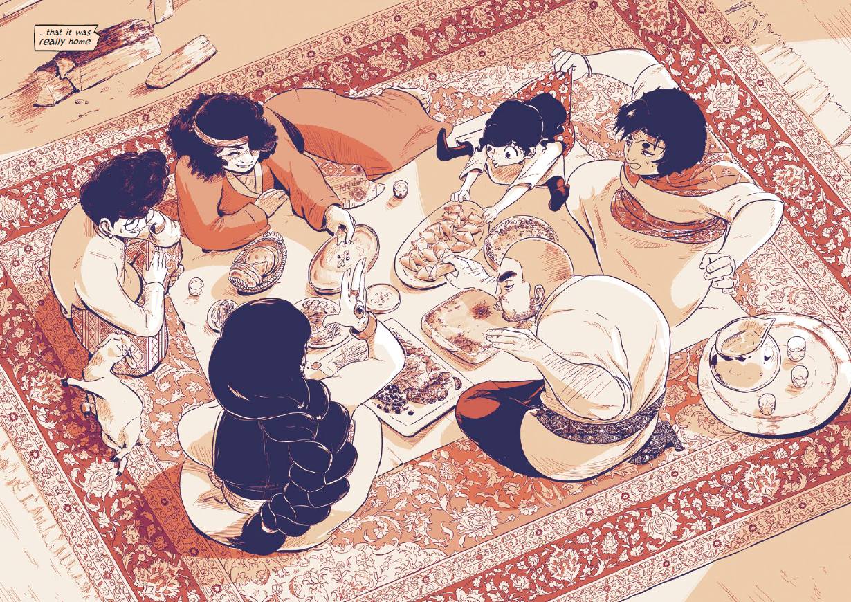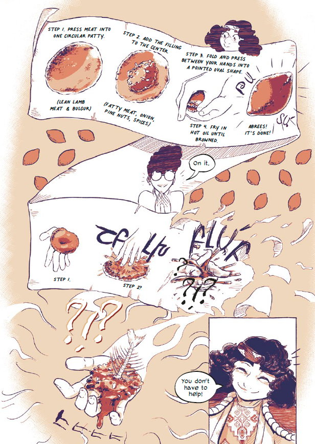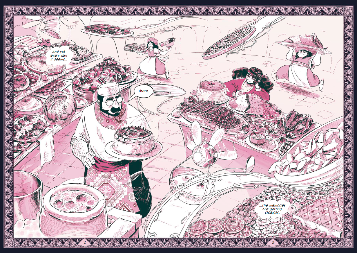 NT: That attention really shines through in every page, it's so luscious. That same attention to detail is also with the food which is a prominent part of your story. From your first double-page spread, there was this kitchen with just all these dishes, and I was like, “I am there with all this food,” I felt like I could just pick one and taste it. I could feel the textures, like a dolma that has this moist texture to it. Or like the kadaif which is nice and crispy, and it's soaking in syrup. I could feel it. I can see it in your detail, you put all of that in there. You can feel the love for the cuisine in your work. I just wanted to talk about that because it was just so striking, the textures.