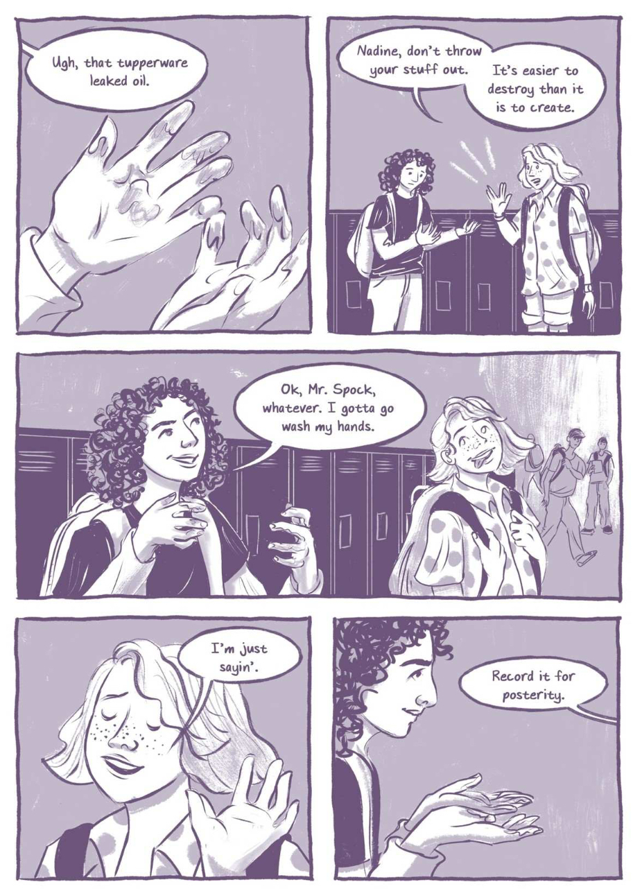 RA: That was another thing—throughout the book you have Nadine drawing as she goes through all these things in her life, processing the events. And it was fun to read that and be like, “Oh, I'm reading this book.” This is clearly the ultimate version of you doing that, right?