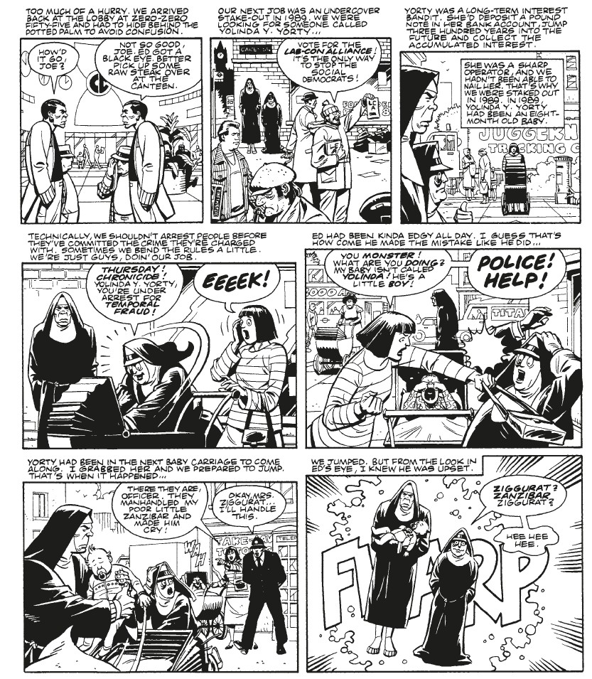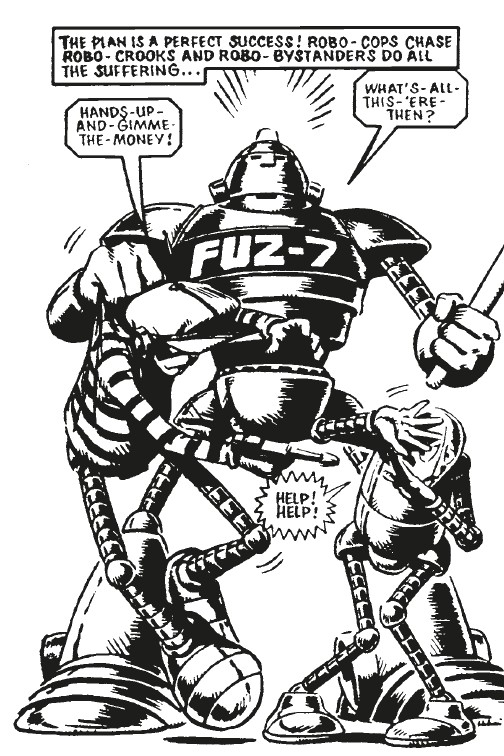 Take the aforementioned Abelard Snazz. The lead character has two brains and four eyes, he is very smart in ‘making up crazy contraptions’ sense and very stupid in ‘forecasting the results of his inventions’ sense. Every story involves the Double Decker Brain encountering some impossible problem (a crime wave across a whole planet, unemployed deities, an approaching black hole) and finding some ridiculous solution that seems to work, until it doesn’t. The first story is drawn by Steve Dillon and it’s a lesson in the simple raising of the stakes as part of a gag: to fight rampant crime Snazz builds robot cops, who succeed so swiftly in stopping regular crime they turn their sensors on lower forms of law breaking (“Using a double negative sir! You are breaking the laws of grammar!”). To stop the overzealous robot cops, Snazz builds robot criminals who go on to harass to human population until he comes off with the brilliant idea of building robot citizens — ending with a perfect panel of there types of robots harassing each other in a closed loop of human uselessness.