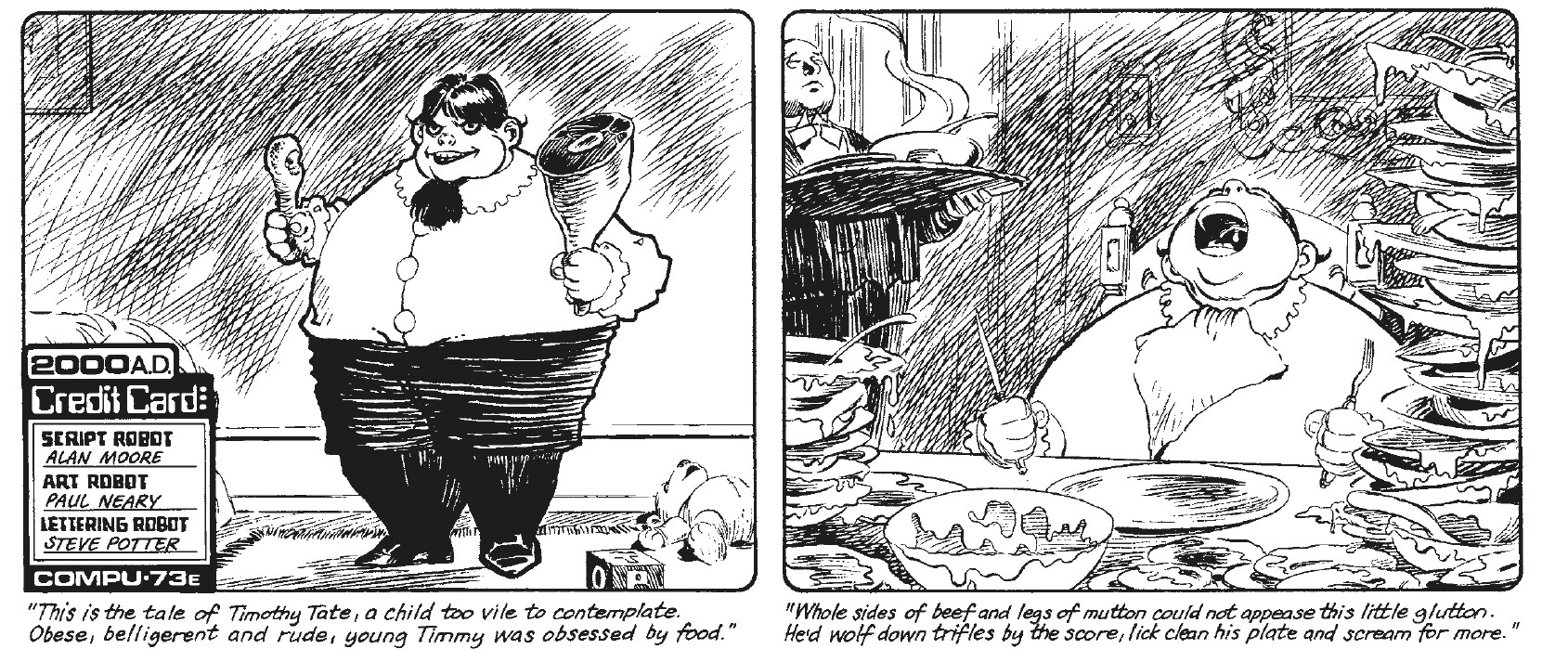 With that being said … the various works Alan Moore did as a young man for 2000 AD, previously collected1 in different trades according to title or theme, are now bound again in a series of fancy-looking hardcovers (yours truly is reading this one in PDF format). These new collections will give you the full Moore experience. The first is dedicated to short stories, covering the years 1980 to 1985. There is one quasi-serial here, Abelard Snazz, with a recurring title character; but you can pretty much open the book at random and fall on a new story. The tales verge from two-pagers to the vast scale of a seven-page epic.